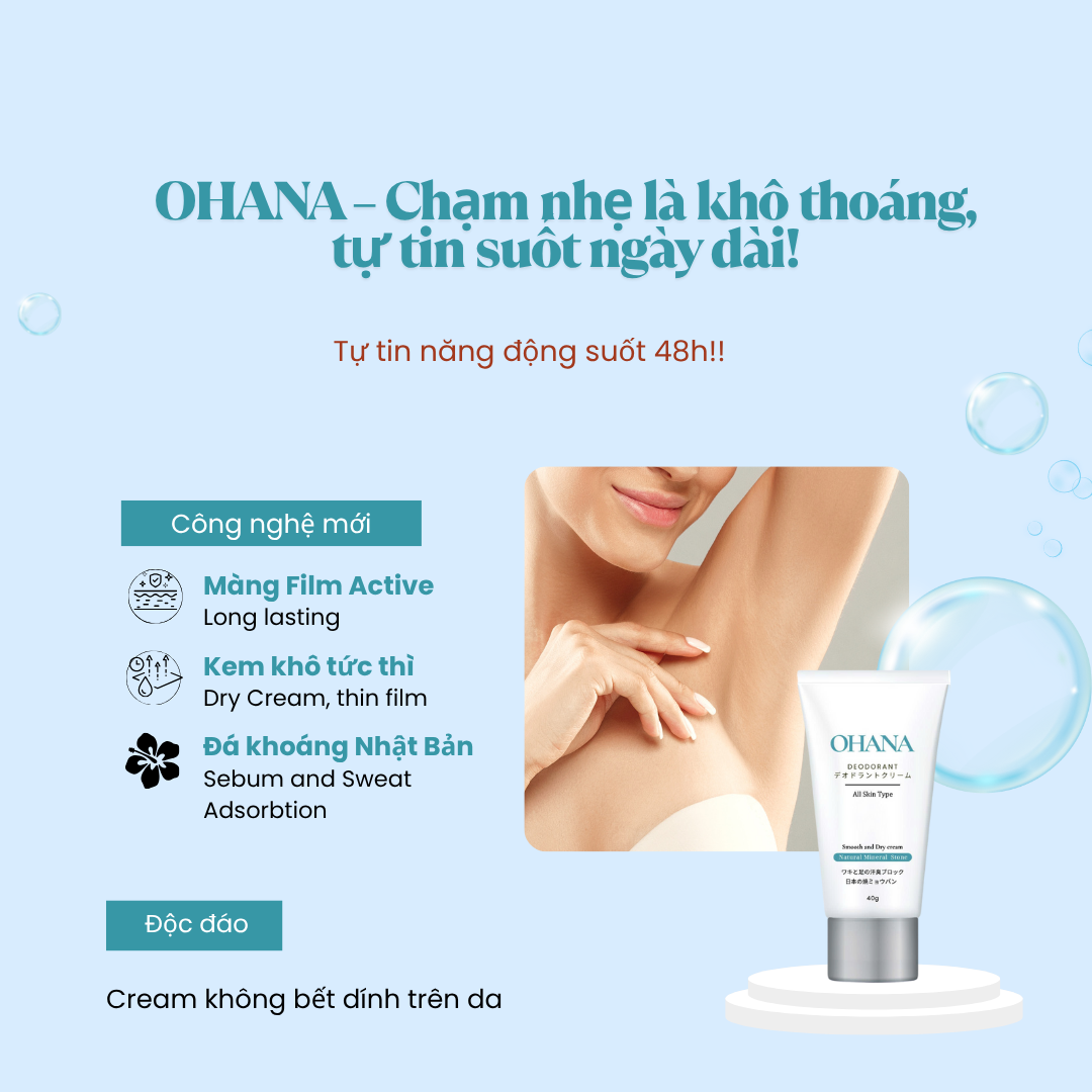 Khử mùi đá khoáng OHANA là sản phẩm chăm sóc cơ thể được nghiên cứu và phát triển dựa trên công nghệ đá khoáng siêu mịn từ Nhật Bản – Takinosei Fine Powder, kết hợp công nghệ Dry Cream tiên tiến giúp chất kem khô tức thì ngay sau khi bôi trên da. Sản phẩm mang đến trải nghiệm khô thoáng vượt trội, an toàn và phù hợp với cả làn da nhạy cảm.